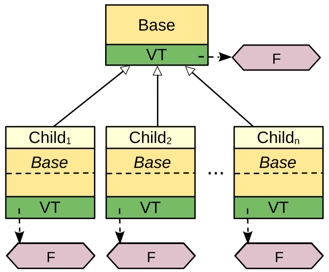 Рассмотренная упрощенная модель позволяет вызывать методы объектов, порождаемых от базового и производного классов аналогично тому, как это делается при использовании виртуализации, демонстрируя тем самым, что возможны и другие пути поддержки ОО полиморфизма.